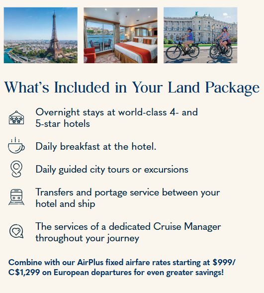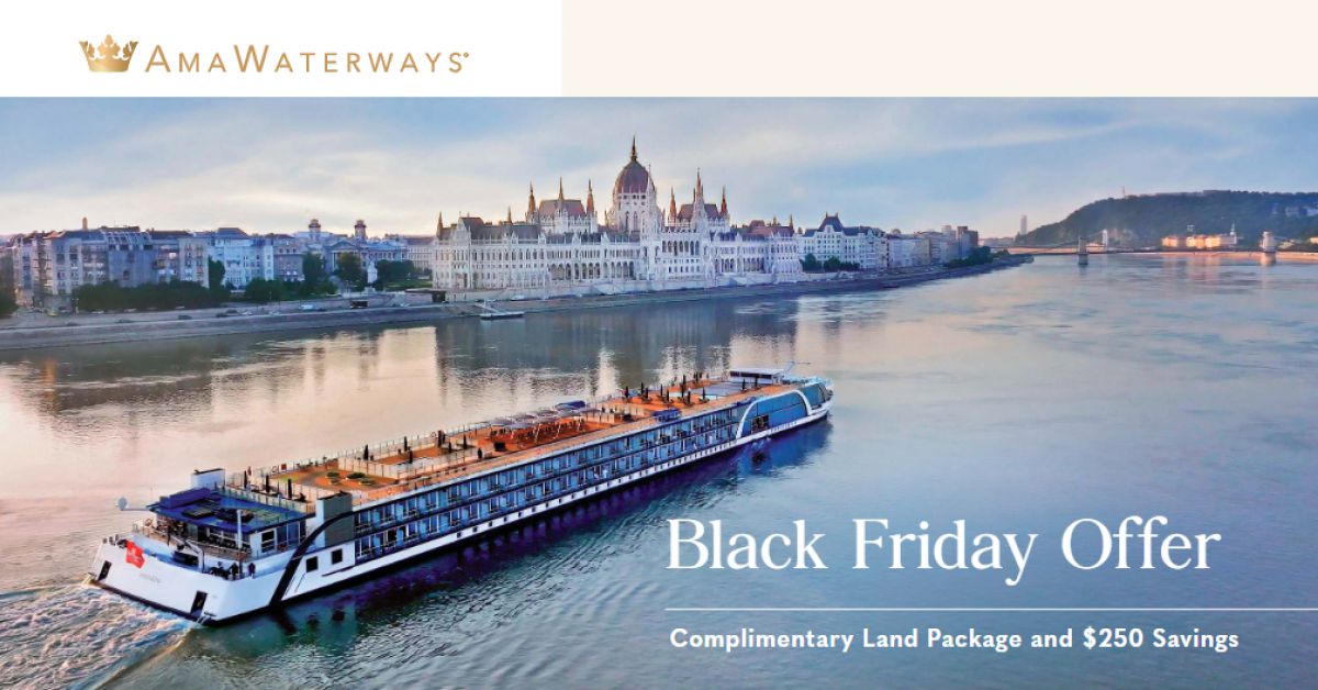 TERMS & CONDITIONS: All rates are per person in USD/CAD for cruise only, based on double occupancy in Category E stateroom, inclusive of port charges and $250/C$300 cruise savings per person. Offer includes one complimentary eligible Land Package per person on new FIT and Group reservations made November 24–December 2, 2025, for select 2026 and 2027 Europe and Colombia sailings. Offer valid on double occupancy; Tour Operators eligible; additional restrictions apply. Availability of sailings and land packages may vary due to local events. Not all advertised Land Packages are eligible; details provided at booking. Additional land packages available for purchase. Complimentary Land is valid only with a full-fare cruise; hotel-to/from-ship transfer included; airport transfers available at extra cost. Offer combinable with AirPlus Rates, Combination Cruise Savings, Past Guest Savings, and Future Cruise Benefit Program. Solo travelers must pay full single supplement to receive complimentary land. Offer not applicable to travel advisors, industry rates, or other restricted offers. Hotel listings are not guaranteed and may be substituted with similar properties; AmaWaterways will confirm hotel details 3–4 weeks prior to departure when Digital Travel Documents are issued. Stateroom upgrades, optional land packages, visas, airfares, and gratuities are additional. Offer is capacity controlled, combinability limited, and subject to change or withdrawal without notice. AmaWaterways reserves the right to correct errors or omissions. Registration as a seller of travel does not constitute approval by the State of California. For full terms and conditions, visit www.amawaterways.com/terms-conditions or www.amawaterways.ca/terms-conditions. CST#2065452-20. V25NOV24JB